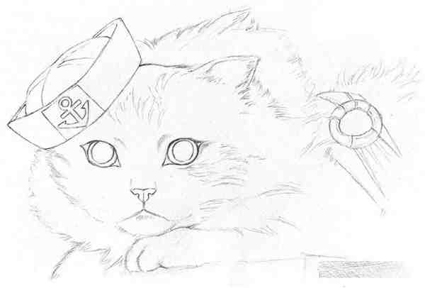 进一步找出猫咪头部更多的轮廓细节,从头部开始,清晰地画出眼睛、鼻子、嘴巴和头顶帽子的轮廓线。