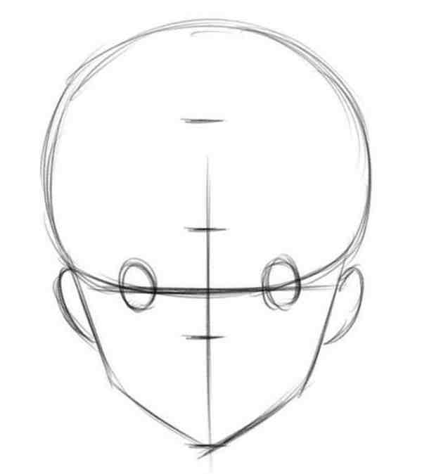完成大概的头部形状,能标出面部的朝向。纵线在面部宽度的1/2上,也是眼睛和耳朵的大概位置,横线在面部长度的1/2上,也是眼睛和耳朵的大概位置。