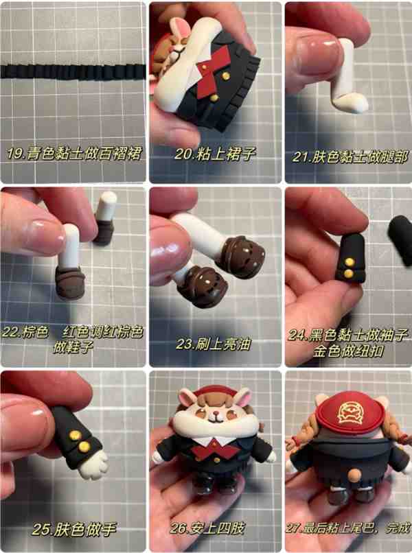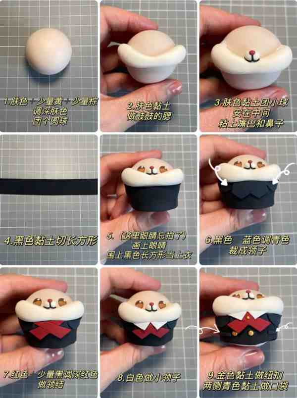 Step 24.黑色黏土做袖子,金色做纽扣。