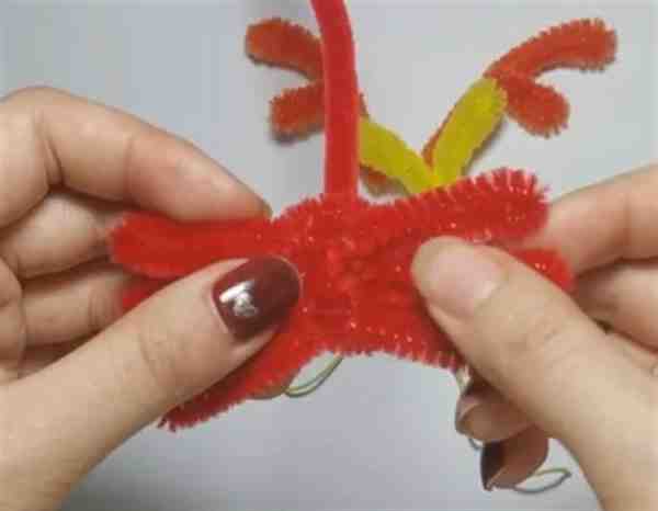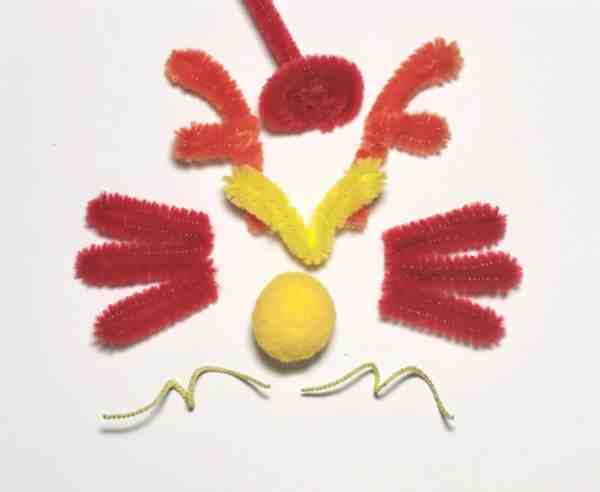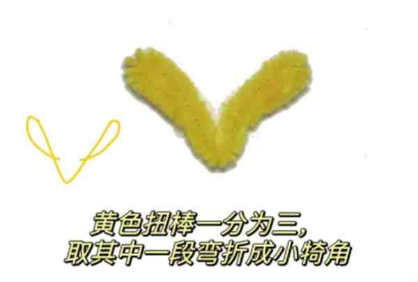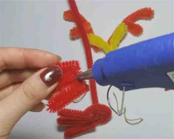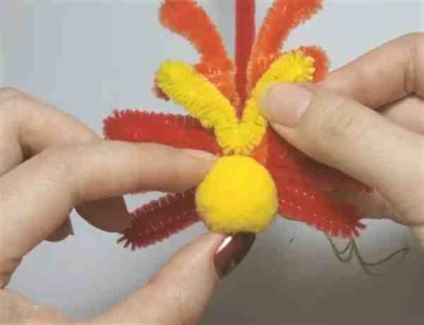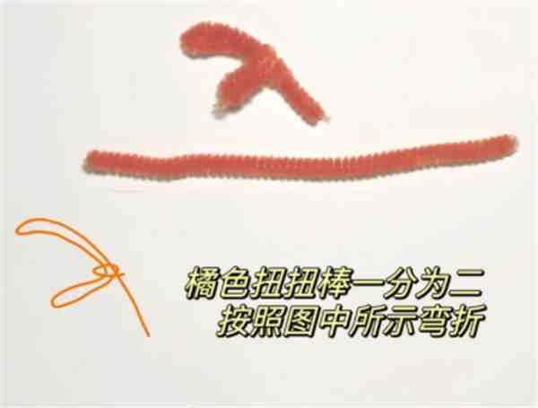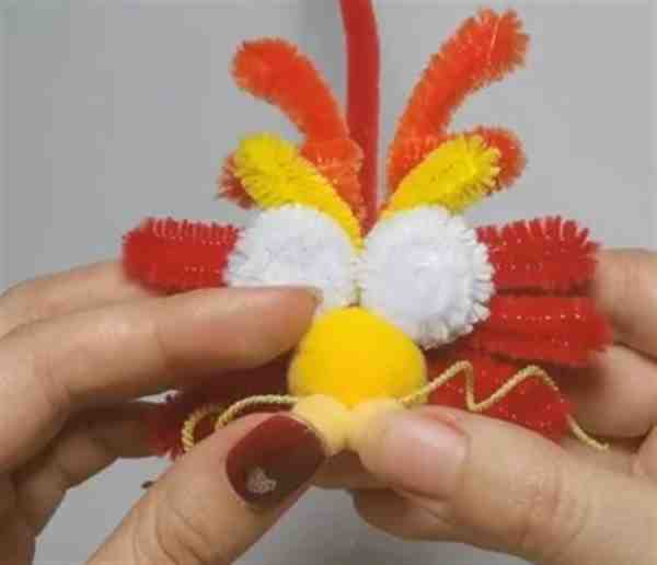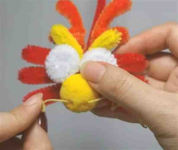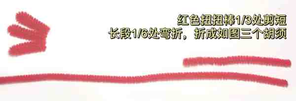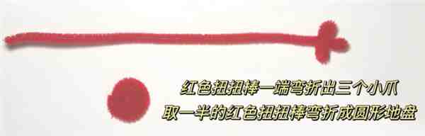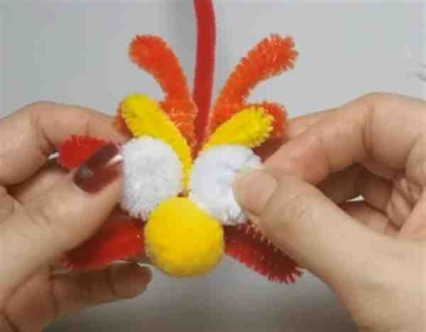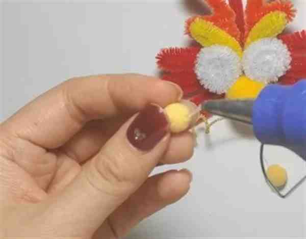 所需材料:扭扭棒(红4、橙1、白1、黄1)、黄色毛绒球(一大两小)、黑色眼睛一对、剪刀、胶枪