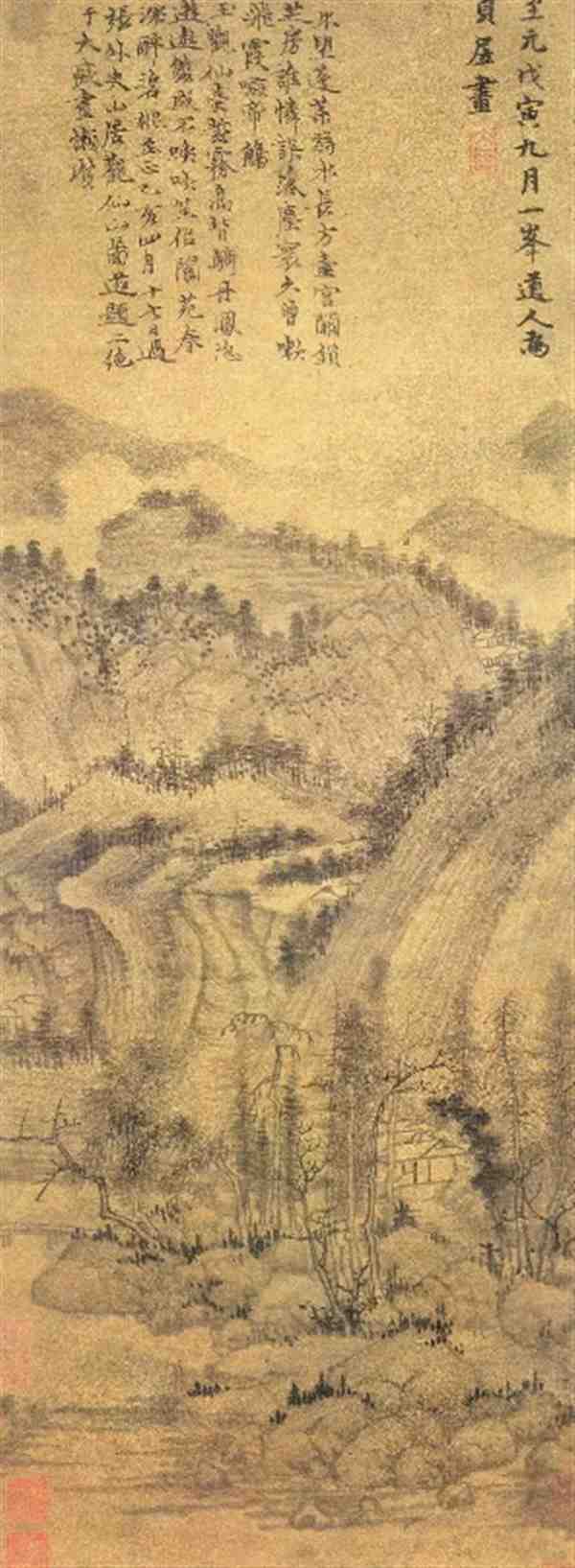 另一方面,黄公望的水墨山水画作品中,皴纹极少,笔意尤为简远。他大量运用烘染的技法,以墨色的深浅变化来表现山的层次感和立体感,并通过在山头上点上焦墨,形成强烈的对比,使画面的白雪的质感更强烈。如《九峰雪霁图》便是此类风格的代表作,画面中树木房舍的线条圆润又劲挺,充满了静谧而深远的美感。