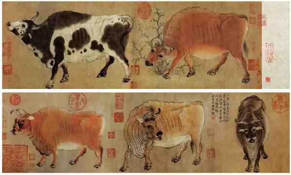 《五牛图》黄麻纸本,纵20.8厘米,横139.8厘米, 是中国十大传世名画,少数几件唐代传世纸绢画作品真迹之一,也是现存最古的纸本中国画。作品现藏于北京故宫博物院。