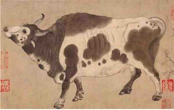第三头为深赭色老牛,筋骨嶙峋,耸背而鸣,白嘴皓眉,老态龙钟。