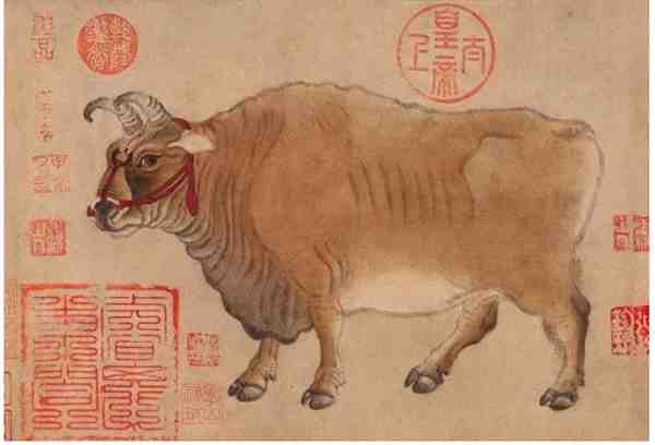 第四头为黄牛,躯体高大,峻角耸立,回首而顾。