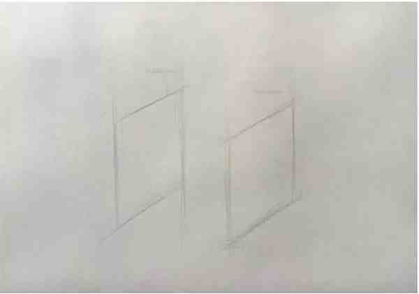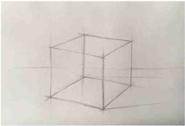 步骤1:起形:参照上面的“正方体的结构素描”进行起稿,找出正方体的边线位置。