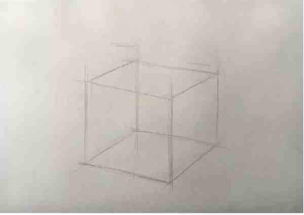 步骤3:继续完善边线,并依据“近大远小”透视原理调整正方体轮廓线。