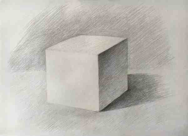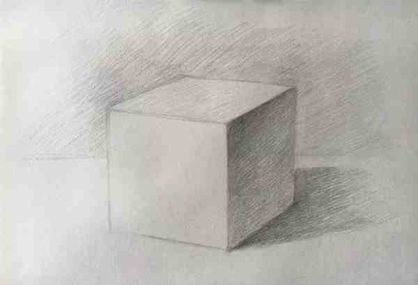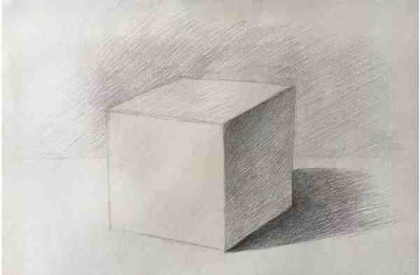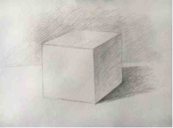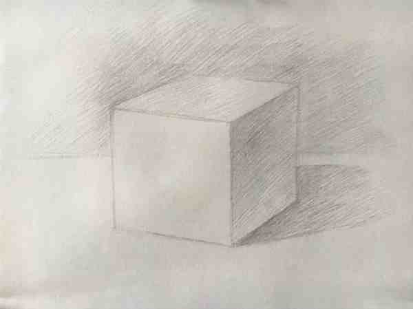 步骤5:上调子:擦掉看不见的结构线,然后根据光源设置,对正方体进行上调子,注意排线方向一致,并且注意线条两头虚,中间实。