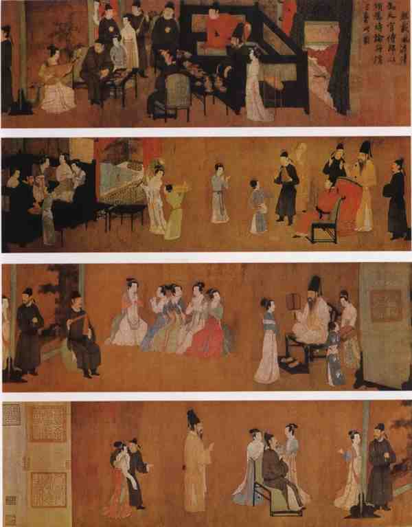 《韩熙载夜宴图》描绘了官员韩熙载家设夜宴载歌行乐的场面。此画绘写的就是一次完整的韩府夜宴过程,即琵琶演奏、观舞、宴间休息、清吹、欢送宾客五段场景。整幅作品线条遒劲流畅,工整精细,构图富有想象力。