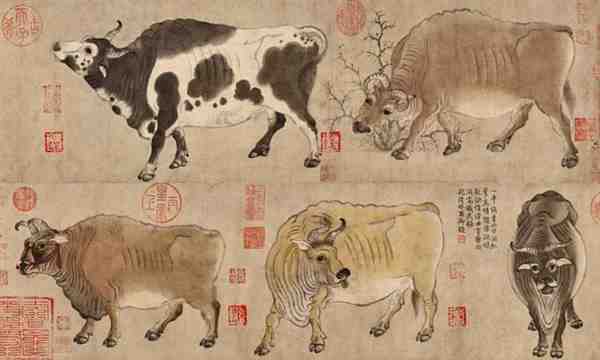 《五牛图》中的五头牛从右至左一字排开,各具状貌,姿态互异。一俯首吃草荆棵蹭痒,一翘首前仰缓步前行,一纵峙而鸣,一回首舐舌,一络首而立。整幅画面除最后右侧有一小树外,没有其他的背景,因此每头牛可独立成章。