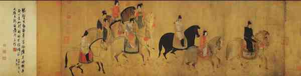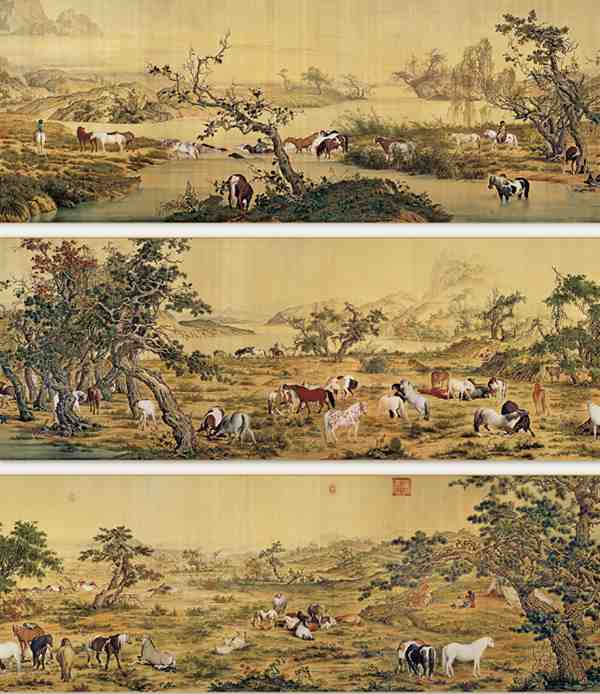 此图共绘有100匹骏马,姿势各异,或立、或奔、或跪、或卧,可谓曲尽骏马之态。画面的首尾各有牧者数人,控制着整个马群,体现了一种人与自然界其他生物间的和谐关系。