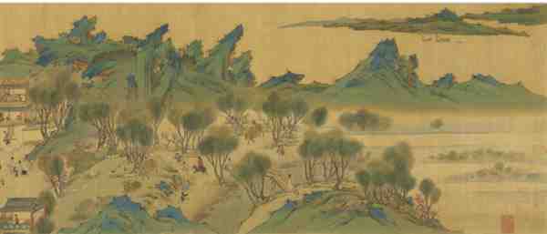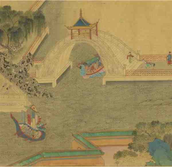 在色彩运用上,仇英借鉴了青绿山水的用色之法,用笔熟练灵活。他融合小青绿和浅绛,用淡墨勾皴,用淡浅的色彩一层层晕染,使画面的色彩丰富而有层次。虽然仇英的色彩基调主要受到其山水、人物画风的影响,使得画面整个色彩显得俗丽了一些,但却更加符合明代苏州城的繁华氛围。