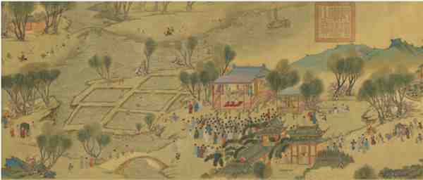 随着画卷的延伸,横跨两岸的虹桥跃然纸上。河中船只往来穿梭,两岸繁忙景象尽收眼底。虹桥上人来人往,热闹非凡。穿过虹桥,草地上嬉戏的小童、戏台上观看民间演出的市民,都成为了画面中的亮点。