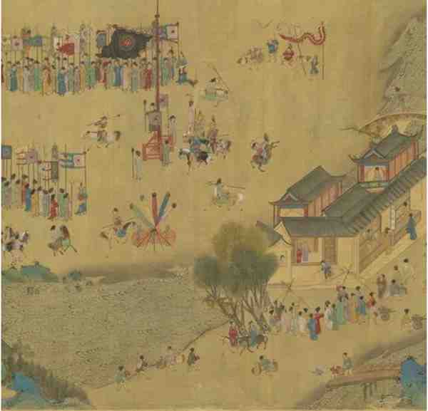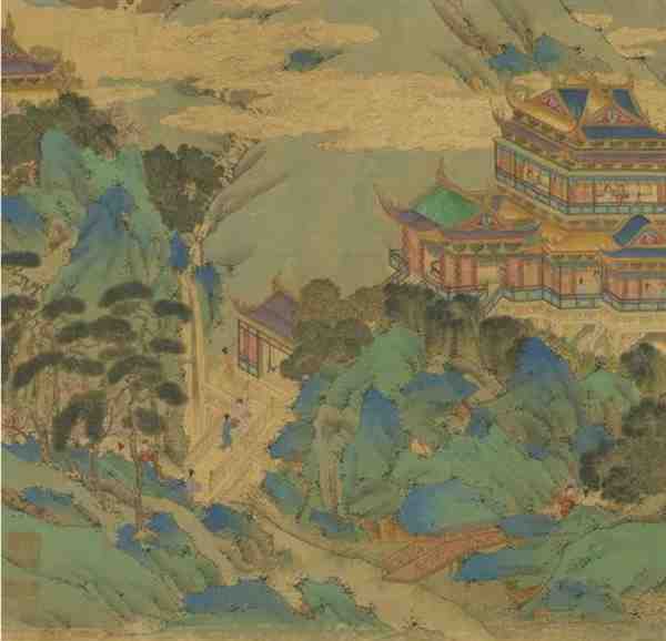最后一段画卷以金明池宫殿收尾。宏伟辉煌的宫廷建筑、热闹的龙舟竞技定格于画面之中,山间宏伟辉煌的楼阁殿宇更是令人叹为观止。