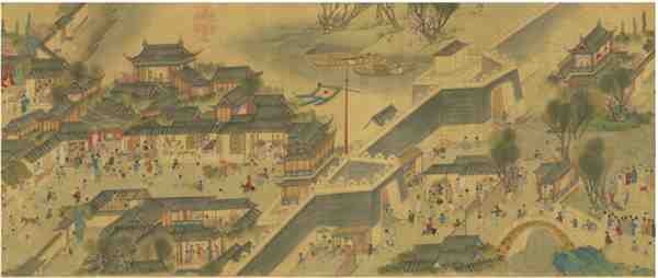答:仇英的《清明上河图》描绘的是明朝中期的苏州城。