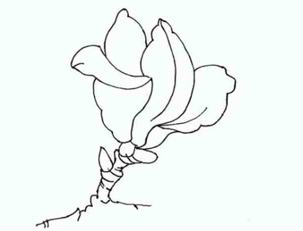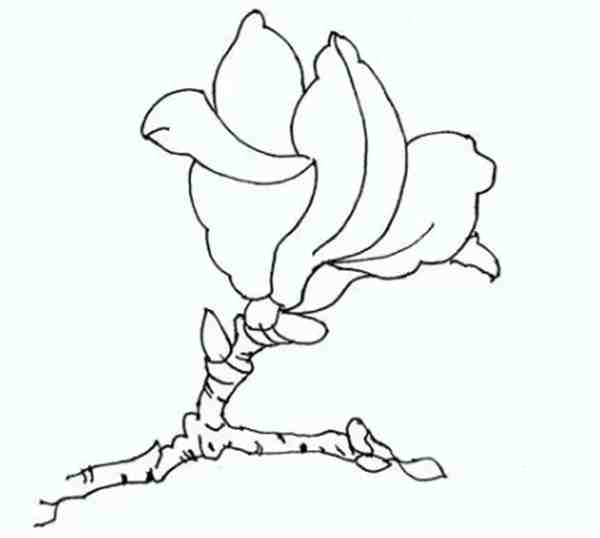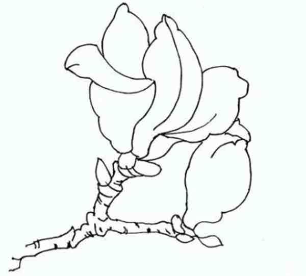 5、 好,接着旁边画上一瓣花,这瓣花只能看到一点点,然后把花瓣底下的花萼、花托、花柄画上,另外注意在旁边画上一个花芽,增加一种生机勃勃的感觉
