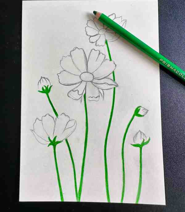 Step 4.缘色画出花茎(画之前擦棹铅笔印)。