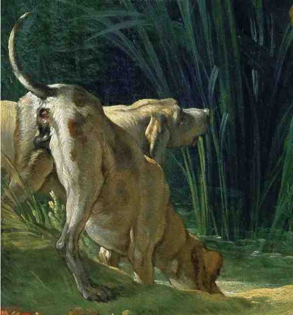 这幅画咋一看似乎是常规的美人出浴图,但左下角的两条猎犬点名了并非如此的深意。饮水中的猎犬抬起头来,似乎听到里什么声音。这不禁让人联想到了《阿克特翁》的故事。