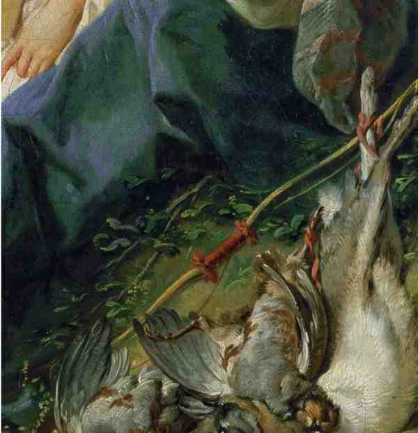 接着我们在回过头来看右下角的猎物-鸽子,鸽子作为爱情女神维纳斯的象征,也是肉欲的象征,所以这个猎物在这里似乎在暗示着“纯洁战胜欲望”