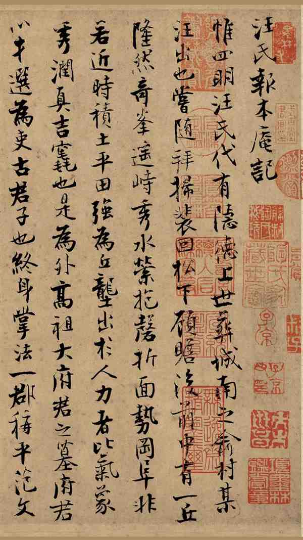 张即之一生作品虽不多,但每一件都堪称精品。其中,《汪氏报本庵记》便是他极具代表性的一件作品。这件作品,用明代詹景凤的话来形容,便是“方劲古拙,斩钉截铁,以成一家”。其用笔矫健有力,点画间充满力量感和冲击力,尤其是在放大后观赏,这种力量感更是显而易见。