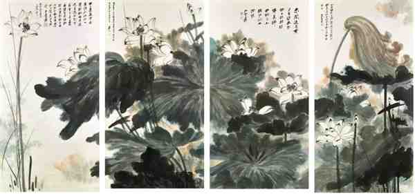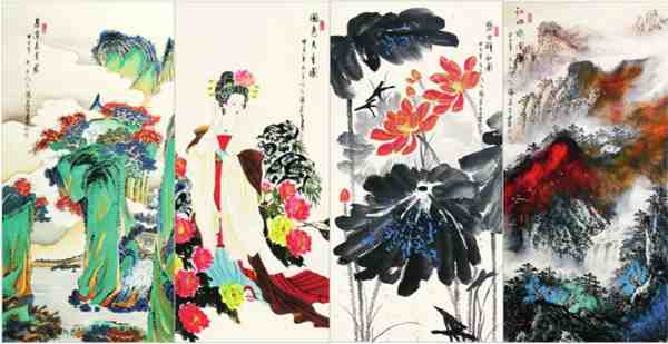 张大千的四条屏作品还体现了他对艺术的创新精神。他在继承传统的基础上,不断探索新的艺术表现形式和手法,使作品既具有传统韵味又不失现代感。这种创新精神不仅体现在画面的构图、色彩、元素等方面,更体现在他对艺术的理解和追求上。他用自己的艺术实践,为我们展示了一个不断创新、不断超越自我的艺术大师形象。
