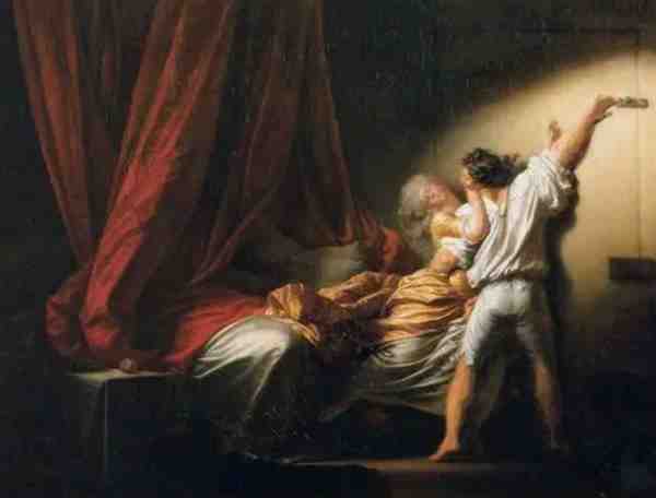 3、《门闩》是让·奥诺雷·弗拉戈纳尔的代表作之一。画面借鉴伦勃朗的照明光表现方法,右上方的一束强光照亮了这对恋人,背景中的红色帷幕加强了画面的戏剧性,使观众在欣赏这幅画时,就好像在观看一出舞台剧。