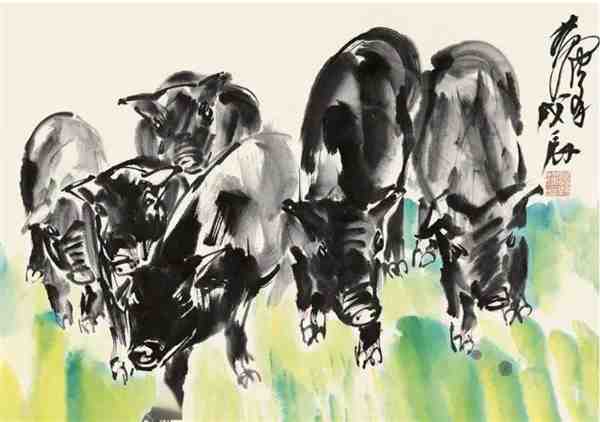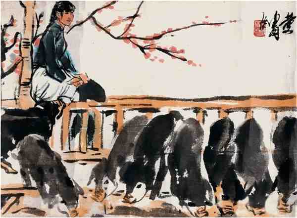 黄胄对猪的描绘也别具一格。他笔下的猪,形象圆滚可爱,憨态可掬。每一幅猪的画作,都仿佛讲述着一个温馨的故事,让人感受到生活的美好与和谐。
