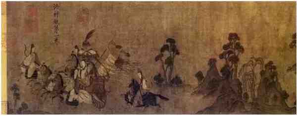 全画用笔细劲古朴,恰如“春蚕吐丝”。山川树石画法幼稚古朴,所谓“人大于山,水不容泛”,体现了早期山水画的特点。此图卷无论从内容、艺术结构、人物造形、环境描绘和笔墨表现的形式来看,都不愧为中国古典绘画中的瑰宝之一。