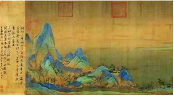 《千里江山图》,北京故宫博物院馆藏珍品。为中国北宋青绿山水画作品。作者王希孟。