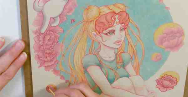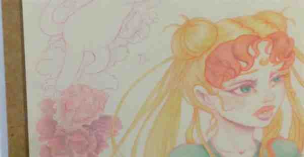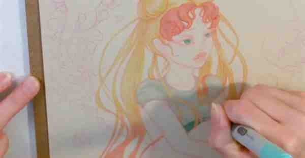 线稿用浅浅的红色彩铅来勾线,然后用马克笔来上色。要有耐心,特别头发,一缕一缕的很前细。可以用稍微浅一点的颜色,慢慢的过度,慢慢的去上。