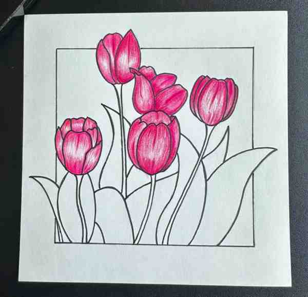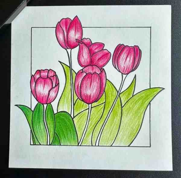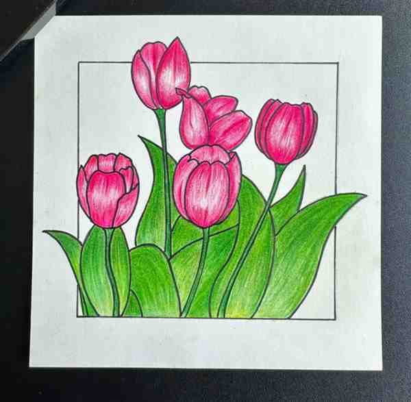 经过精心的绘画和涂色,我们的郁金香花朵作品终于完成了!看着这片五彩斑斓、充满生机的郁金香花海,仿佛感受到了春天的气息和温暖。每一朵郁金香都是我们用心和创意的结晶,希望大家能够喜欢并珍惜这份美好。让我们一起继续探索绘画的无穷魅力,用色彩和线条创造更多的美丽和欢乐!