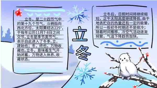 立冬已至,寒气逼人,但冬日的温暖在于我们对生活的热爱。画这张小报,我们以色彩和线条描绘了立冬的韵味,展现了自然的神奇与生活的美好。愿大家在这个冬天,依旧保持对生活的热爱,对自然的敬畏,对美好的追求。