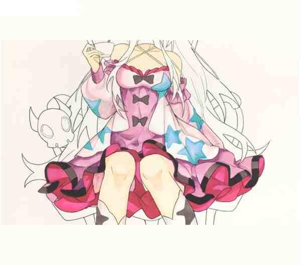 STEP6: 用67号蓝色填充服装上的蓝色星星装饰,裙摆内部用红色加深,胸口蝴蝶结部分用87号色填充。