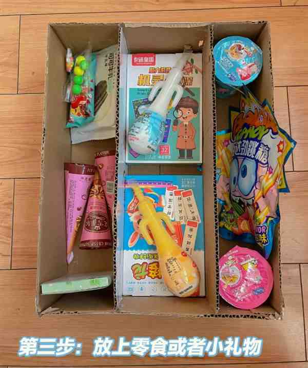 所需材料:纯牛奶纸箱、2张素描纸、各种小礼物