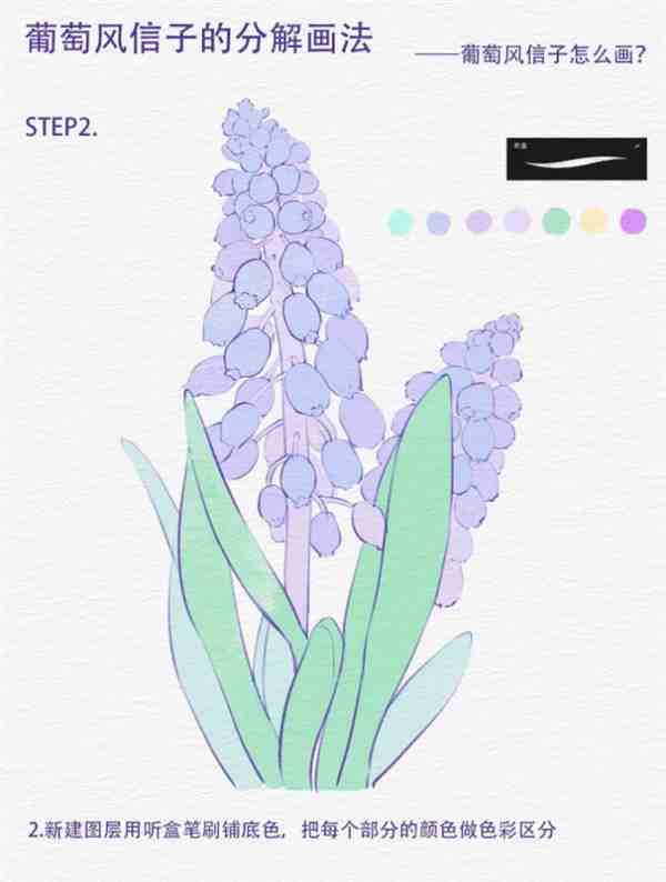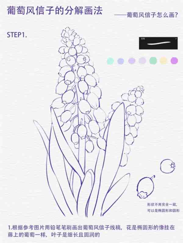 Step 1.根据参考图片用铅笔笔刷画出葡萄风信子线稿,花是椭圆形的像挂在藤上的葡萄一样,叶子是细长且圆润的。