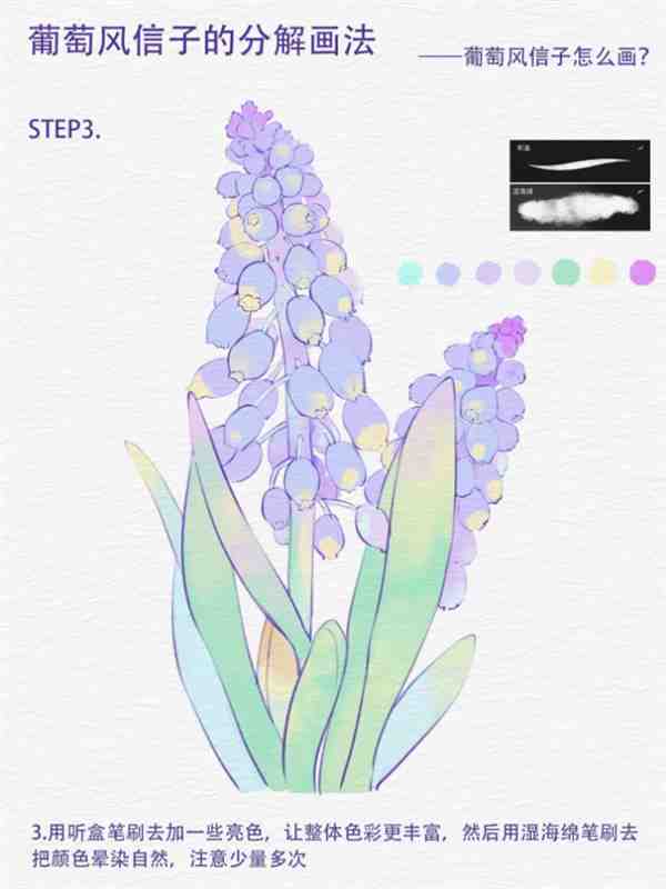 Step 3.用听盒笔刷去加一些亮色,让整体色彩更丰富,然后用湿海绵笔刷去,把颜色晕染自然,注意少量多次。