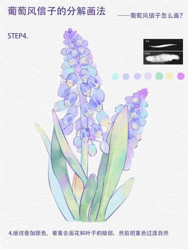 Step 4.继续叠加颜色,着重去画花和叶子的暗部,然后把重色过渡自然。