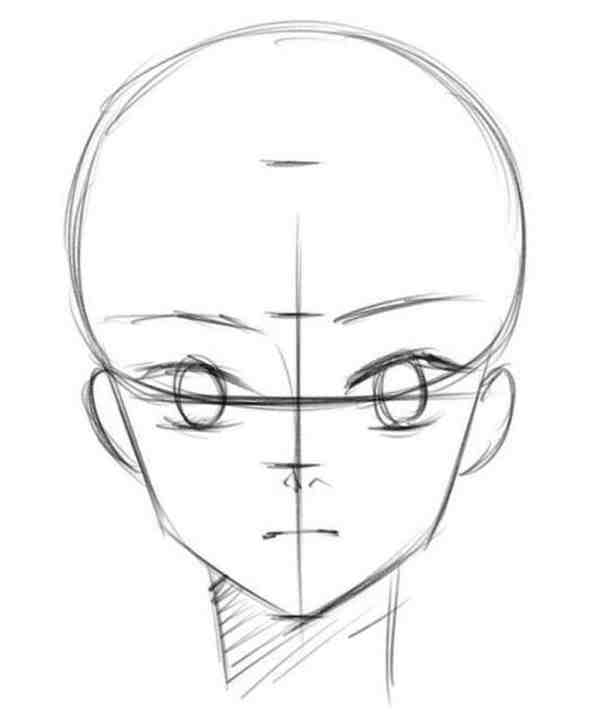 完成大概的头部形状,能标出面部的朝向。纵线在面部宽度的1/2上,也是眼睛和耳朵的大概位置,横线在面部长度的1/2上,也是眼睛和耳朵的大概位置。