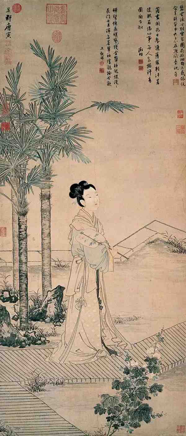 《画班姬团扇》取材自汉班婕妤的〈怨歌行〉:「常恐秋节至,凉飙夺炎热,弃捐箧笥中,恩情中道绝。」榈树下,班姬持扇伫立,庭前复植有蜀葵,点出夏末时令。幅中画花用没骨法、仕女脸部的三白法,均与杜菫〈玩古图〉极近,据此可追索唐寅的风格源流。另外,由画上方文徵明题识的书体研判,应为文氏四十岁后所作。文与唐同年,故本幅可定为唐寅此际(一五Ο九顷)的作品。