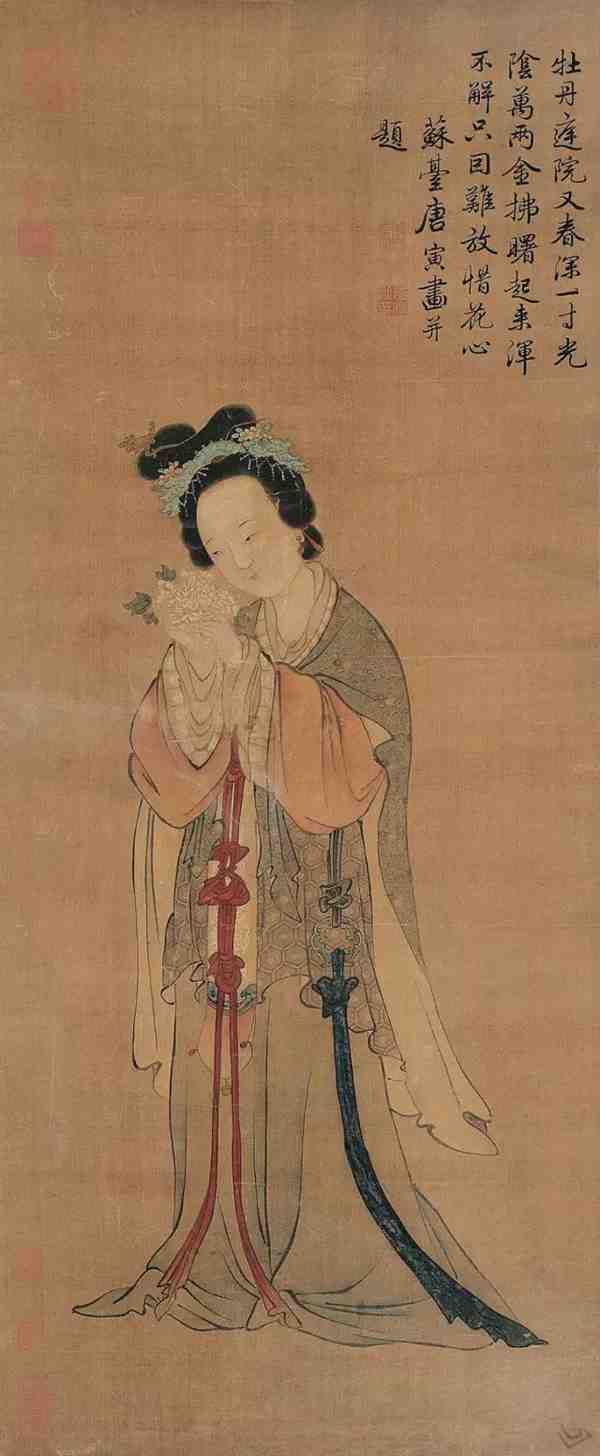 唐寅是一个饱尝了世态炎凉滋味的画家,同时又是一位才华横溢的江南才子,但仕途落魄。二十九岁时因为科场舞弊案被无辜牵连,蒙冤入狱。他遭此打击,再也无心为吏。许多昔日向他求诗乞画的座上客,转而将他视若路人。图中玉立一高髻簪花女子,右手持扇,左手拈花,体态丰盈,举止安详,头部勾勒精工,晕染匀称,是富贵人家之少妇形象。