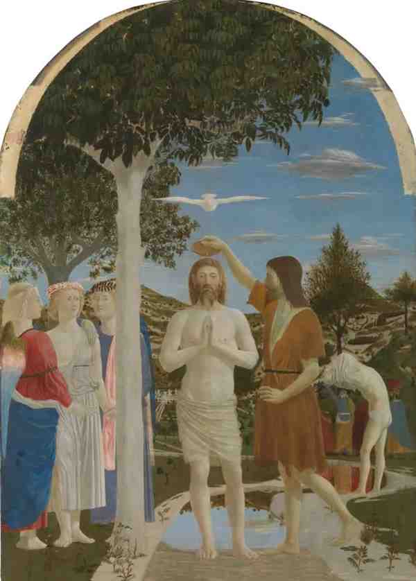 这幅画神奇的地方在于,告诉了我们在 很早的时期,文艺复兴初期,就有艺术家特别善于处理空间关系,并且将它运用到绘画当中。在这幅画中,画家描绘了基督在受约翰洗礼的场景,在这幅画中鸽子象征着圣灵,被画为云一样的形状。拿着碗的约翰身后是一个穿着白色三角裤的男人,他的脚踩在水中。