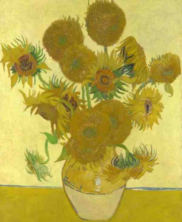 第一眼看到梵高的向日葵,我们就会被向日葵跳跃的颜色所吸引,在这幅画中,可以看到整幅画都是黄色调,柠檬黄、土黄、深黄,各种黄色交织在一起,传达出了画家对于生命的热爱。梵高在他的一生中画了11幅向日葵,这是其中的一幅。