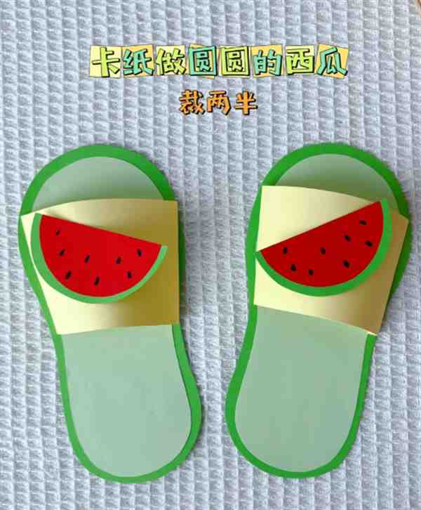 5、最后,为了增加拖鞋的趣味性和美观度,我们可以用卡纸剪出西瓜的形状,并粘贴在拖鞋的鞋面上。