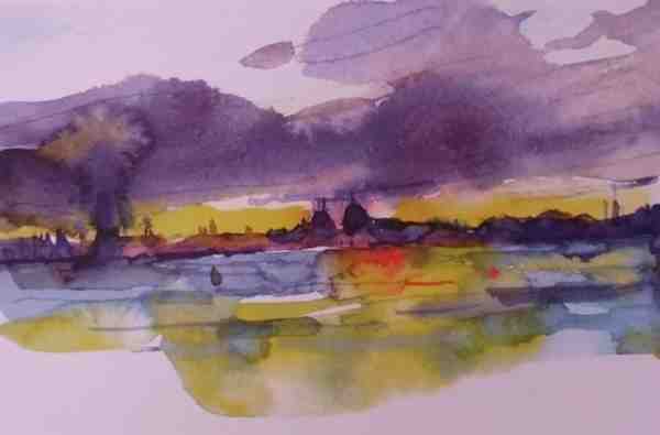 湿画法的特点:清新润泽、色彩生动、变化莫测,适于表现轮廓模糊的远山、天空,质地圆润、光滑的物体或浑然天成的朦胧意境的营照,大写意式的氛围渲染。此画法能充分发挥出水彩艺术中轻快、润泽、酣畅、洒脱的艺术特质与魅力。
