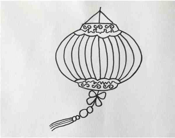 步骤六:画出灯笼下面的挂件,一个蝴蝶结和一个坠穗。