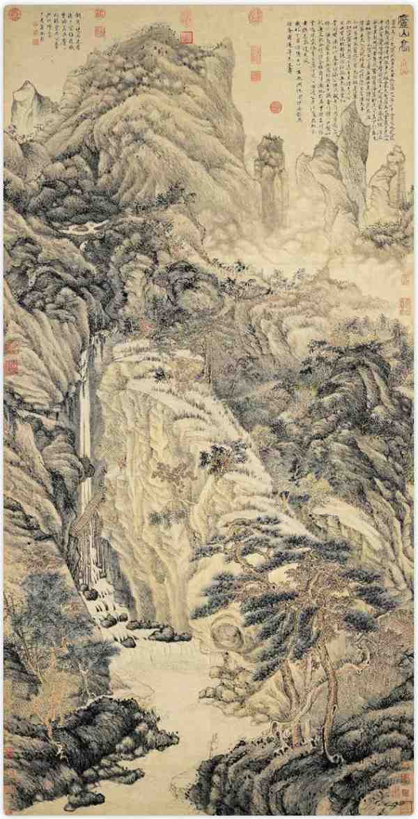 沈周的山水画,上溯五代董源、巨然,近学“元四家”,对黄公望、王蒙、倪瓒、吴镇等大师的画作都有深入研究。他尤爱王蒙、黄公望的画风,从中汲取精髓,逐渐形成了自己独特的粗笔山水风格。他的早期作品《庐山高图》,便明显带有王蒙的笔意。而到了中年,他的画风开始发生变化,53岁时的《虎丘送客图》已经由繁到简,展现出自家面貌。到了58岁的《湖山佳趣图》,沈周的山水画已经完全成熟,形成了粗笔山水为主的独特画风。