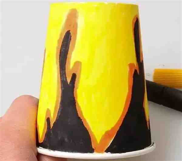 2、接下来,我们使用黄色和黑色画笔在另一个纸杯上创作火箭下方的火焰效果。