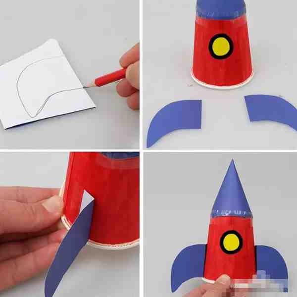 4、将制作好的火箭头粘贴在纸杯上,然后我们在同色系的蓝色纸上画出机翼并剪下来,将其粘贴在纸杯两侧。