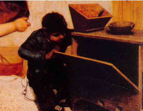 【作品内容】图中的焦点是穿红衣跪着筛麦的年轻妇女,她几乎占据了整个构图的中心,作者以高超的写实技巧,独特的背影表现方式,去描绘她那毫无修饰的自然身姿,着实耐人寻味。红衣妇女的头向前微俯着,裸露出洁净修长的颈项,被紧身衣包裹着的背影丰满而健壮,手臂圆润而结实。她那正在筛麦的优美姿态,充满了青春的力量,给人以健美的感觉,可以想像这是一位健康而美丽的农村姑娘。
