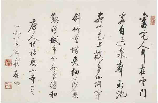 释文:旧宅人何在,空门客自过。泉声到池尽,山色上楼多。小洞穿斜竹,重阶夹细莎。殷勤望城市,云外暮钟和。唐人张祜《惠山寺》一首,一九八五年秋,启功。