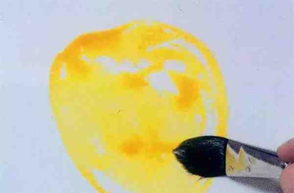 1、红色的苹果皮间隙会透出部分黄色来,所以先涂上底层的黄色水彩颜料。在这一步骤中直接把高亮部分留为空白。